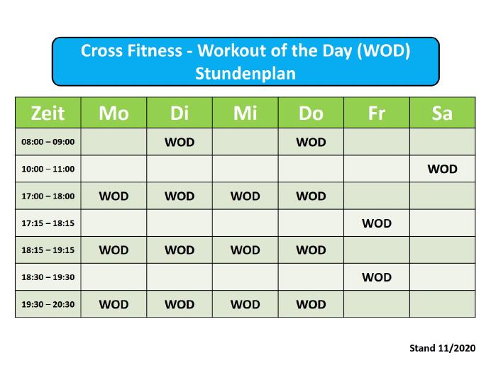 Mit unseren Workout-of-the-Day-Klassen gehen wir ganz neue Wege. Diese Trainingsstunden werden dadurch charakterisiert, dass keine Trainingstunde wie die vorangegangene ist. Ständig variierende Anforderungen sorgen für Abwechslung, wodurch jeder Teilnehmer individuell gefordert wird. Dabei steht der Coach immer helfend und anleitend zur Seite.